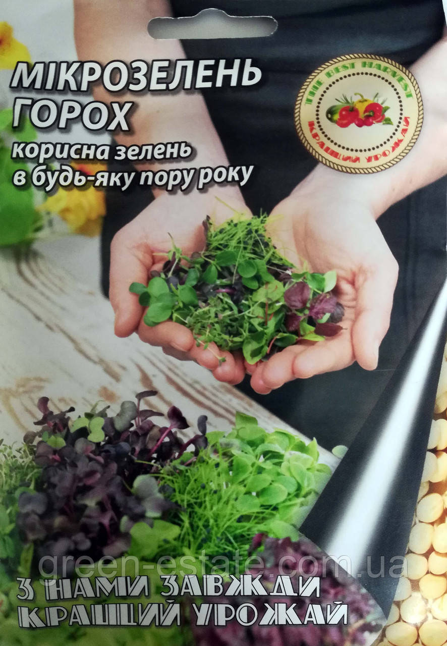 Вітамінно-мінеральна харчова добавка. Рекомендується для вирощування під зріз у грін-боксах. Мікрозелень має яскраво-виражений, приємний смак стручкового гороху. Вітаміни, що містяться в зелені, входять до складу найважливіших ферментів вуглеводного та енергетичного обміну. Мікрозелень гороху багата протеїнами, фосфором, залізом. Насіння гороху Кращий Урожай містить вітаміни групи В, а також С, РР, Е, К. Відмінно підходить як для прикраси страви, так і в якості самостійного продукту.